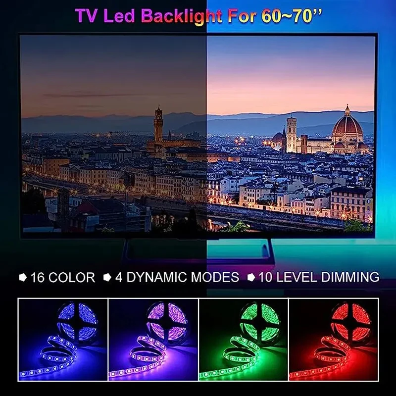 RGB Multi-Color Strips with controller: Adjust static colors, brightness, and color-changing modes.
